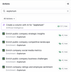 The Explorium integration provides several company-level enrichments that can be used directly inside Clay tables. Each action returns structured data that supports prospecting, segmentation, scoring, and research workflows.